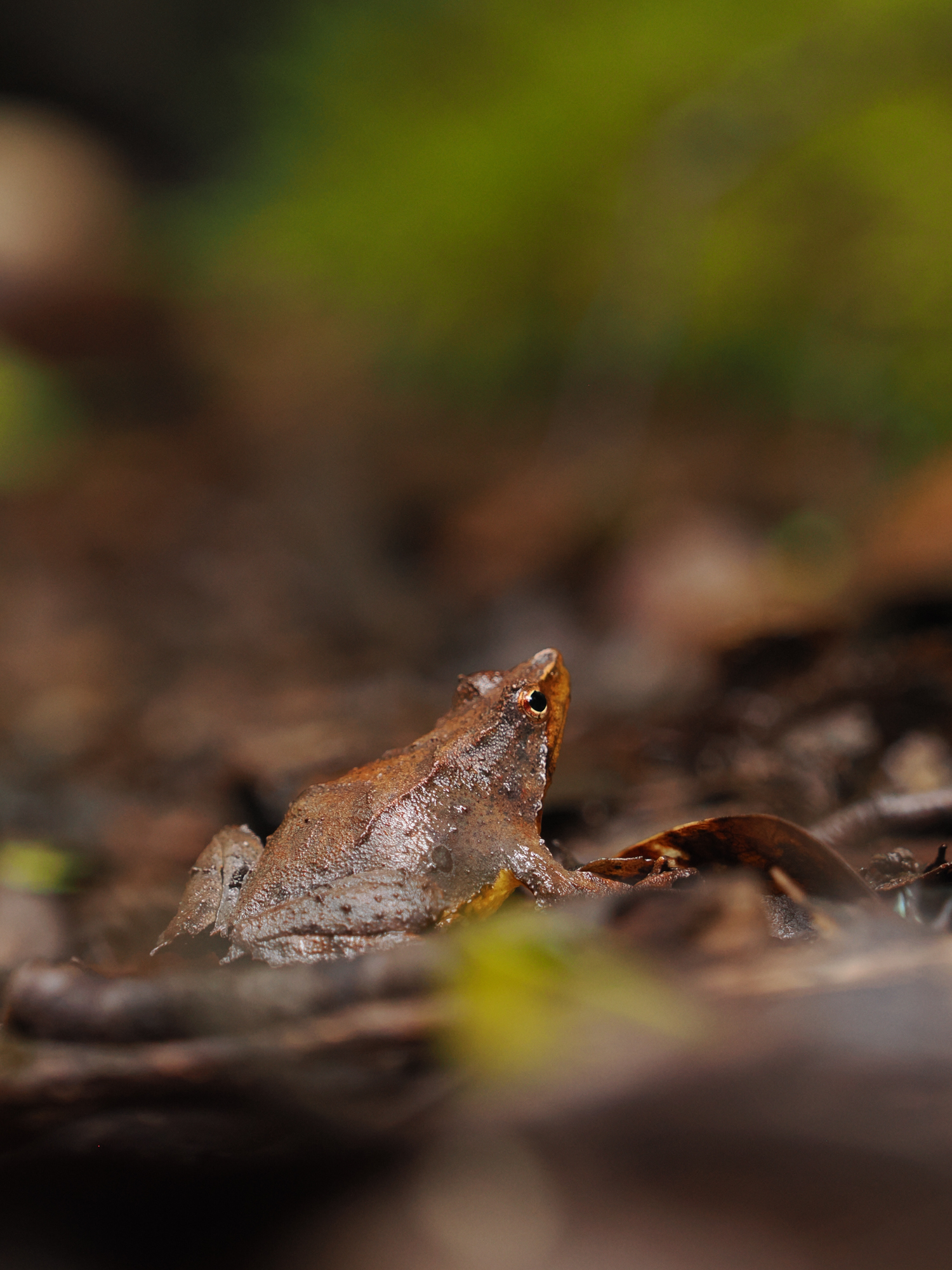 Its skin ranges from deep brown to mossy green, patterned to blend seamlessly with its surroundings. When threatened, it performs a tiny leap before lying still on its back, using its underside to confuse predators as a master of disguise. A miniature marvel that could easily go unnoticed by anyone rushing through the forest.