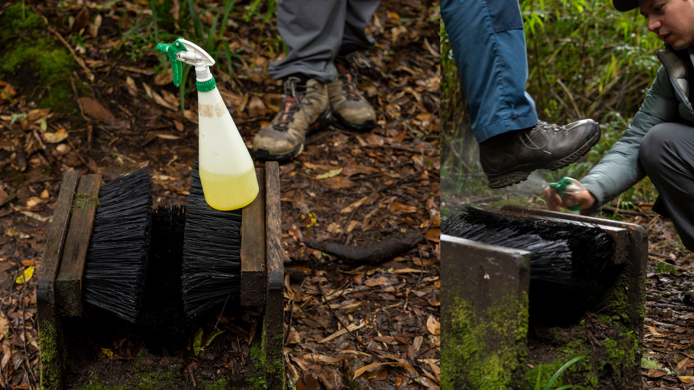 Upon entering the trail, we sprayed our shoes and used a brush to remove all debris in an effort to reduce any chance of the fungus entering the environment. After just a few minutes, Felipe had found one, and while he kept pointing at the leaves on the forest floor, I still couldn’t see it.
